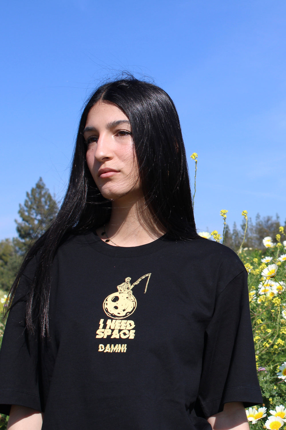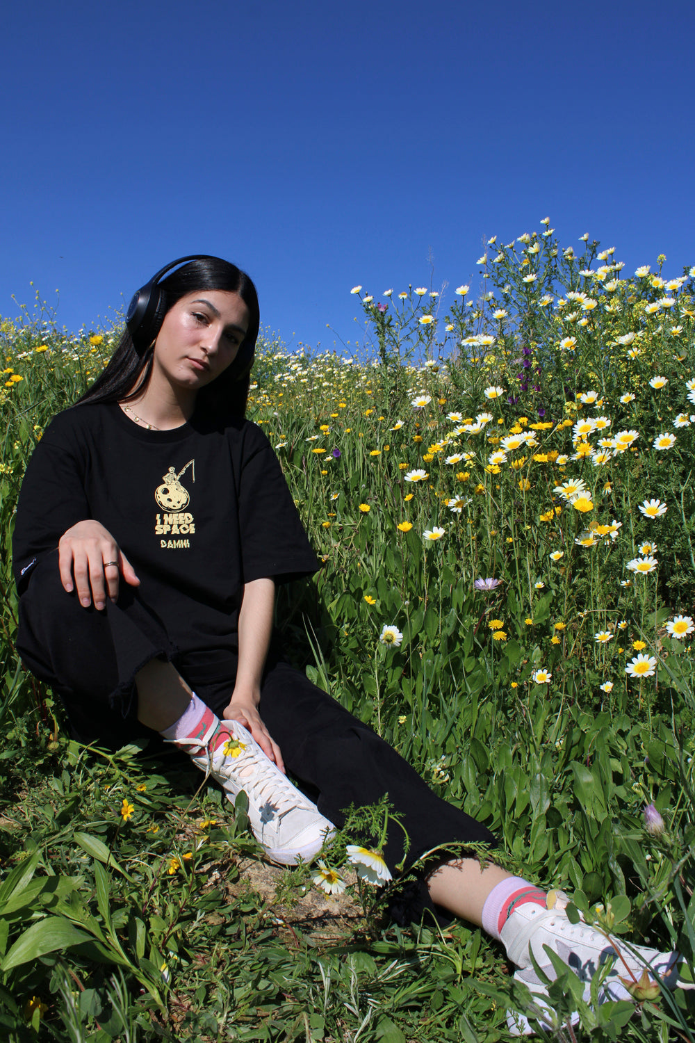 Estampación realizada en serigrafía color amarillo y bordado en el mismo color, todo en la parte delantera.